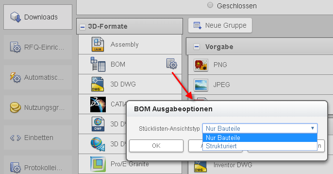 - Wählen Sie die entsprechende Stücklistenansicht aus: Nur Bauteile oder Strukturiert.