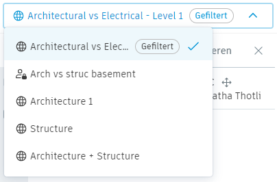 Klicken Sie, um eine Liste der in Model Coordination erstellten Ansichten anzuzeigen. Klicken Sie auf eine Ansicht, um die in dieser Ansicht gespeicherten Modelle und Konfigurationen anzuzeigen.