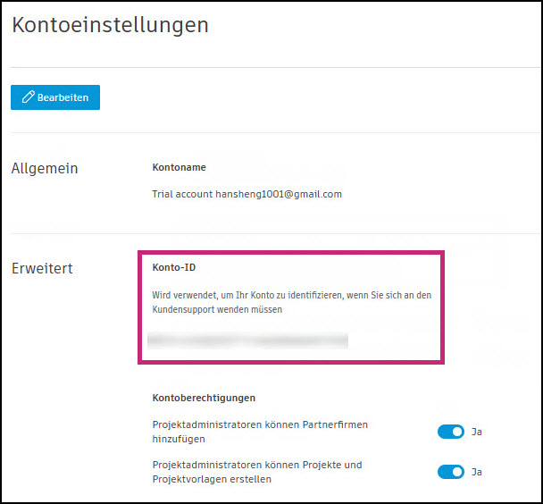 Für Vorgänge im Zusammenhang mit dem Support oder zum Verbinden von individuellen Integrationen benötigen Sie eine eindeutige Autodesk Construction Cloud-Konto-ID (nur für Enterprise-Konten). Zum Anzeigen: