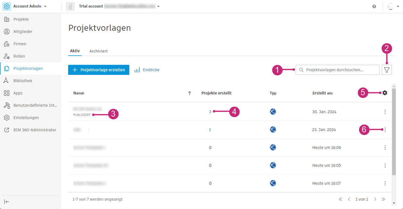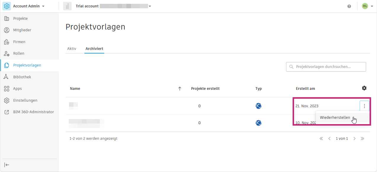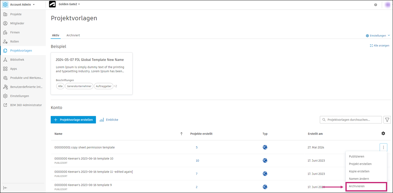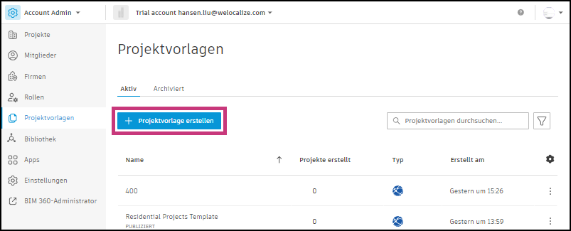 Aktive und archivierte Projektvorlagen finden Sie im Werkzeug Projektvorlagen in Account Admin.