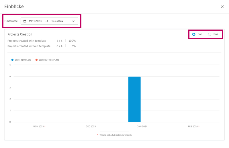 Im Dashboard können Sie sehen, wie viele Projekte in Ihrem Konto aus Vorlagen erstellt wurden, sowie den angezeigten Zeitrahmen anpassen oder zwischen Balken- und Liniendiagrammen wechseln.