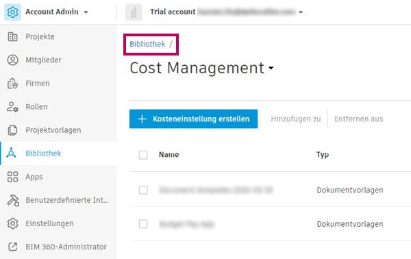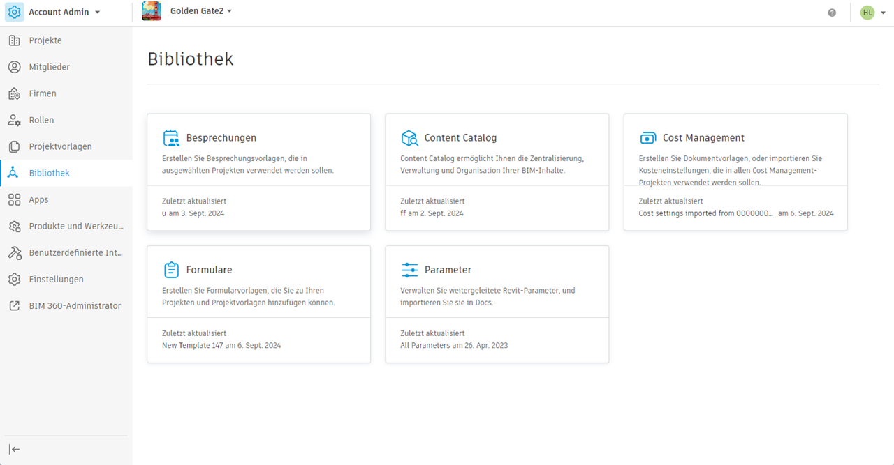 Das Bibliothekswerkzeug in Account Admin ist eine zentrale Sammlung von Objekten, die in Projekten und Projektvorlagen in einem Konto verwendet werden können.