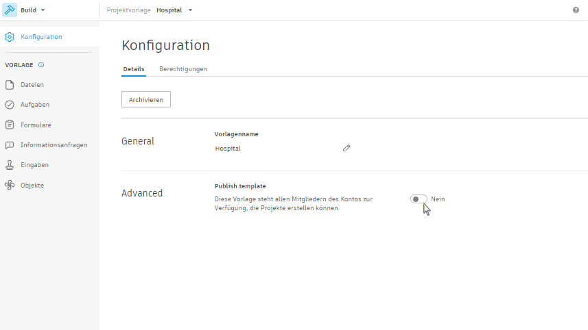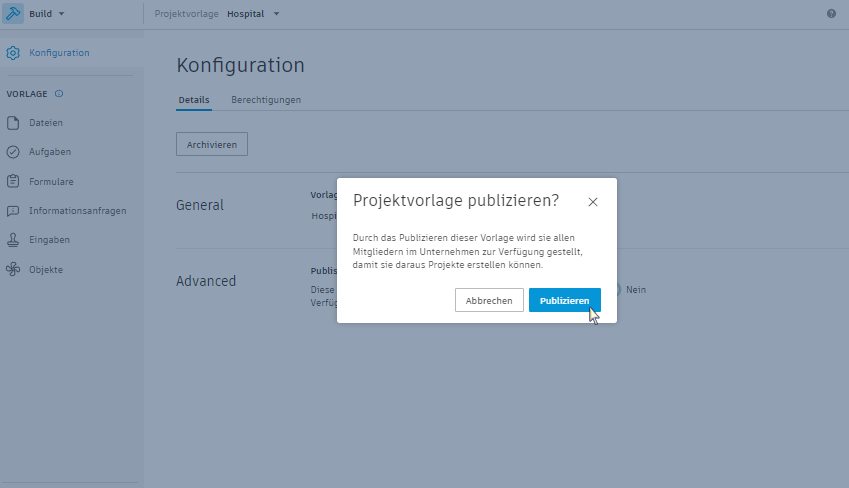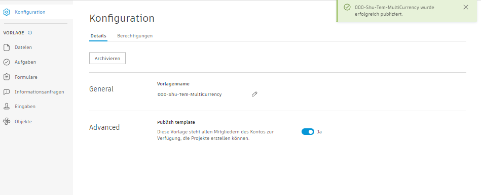 Aktivieren Sie im Menü Konfiguration im Projektstatus Erweiterte Details den Schalter Vorlage publizieren.