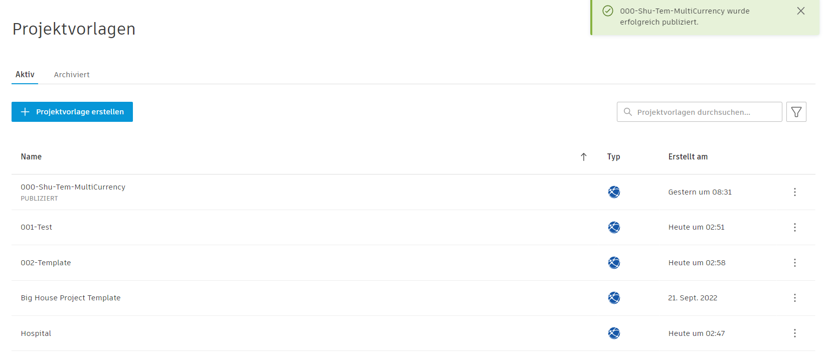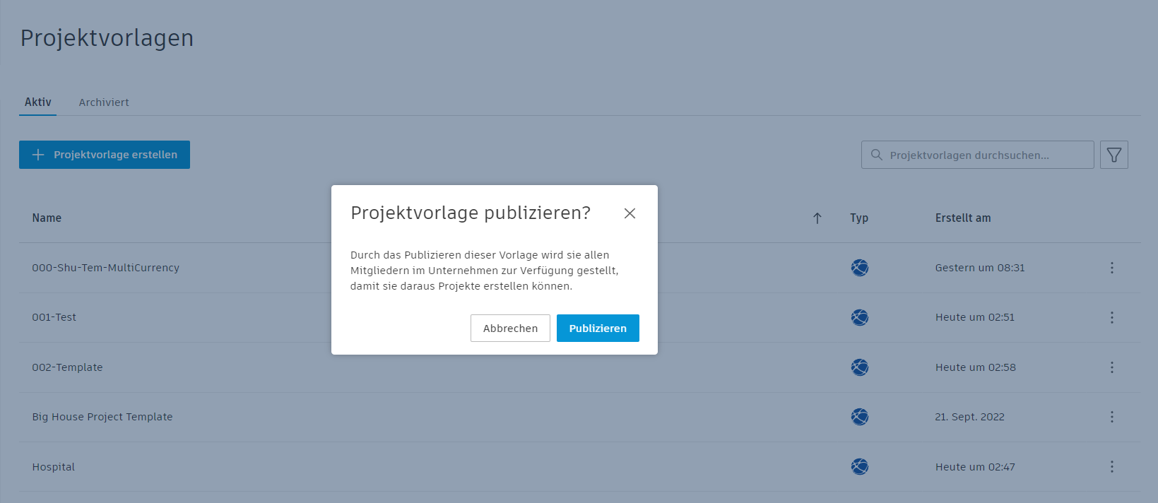 Um eine Projektvorlage zu publizieren, wählen Sie die gewünschte Projektvorlage aus.