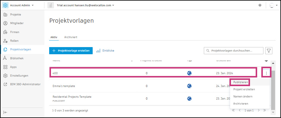Klicken Sie auf die drei Punkte in der Zeile mit der Projektvorlage und wählen Sie Publizieren.