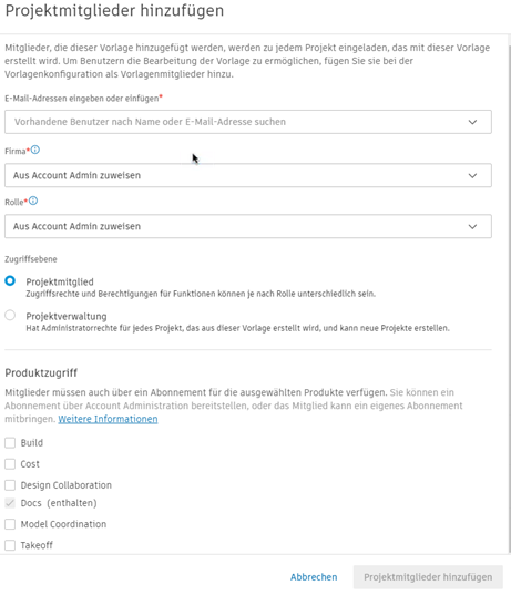 Nachdem die Mitglieder hinzugefügt wurden, können Sie ihre Firma, Rolle und Zugriffsebene sowie den Produktzugriff bearbeiten: