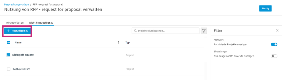 Nachdem Sie Projekte ausgewählt haben, klicken Sie auf Hinzufügen zu, um Vorlagen hinzuzufügen.