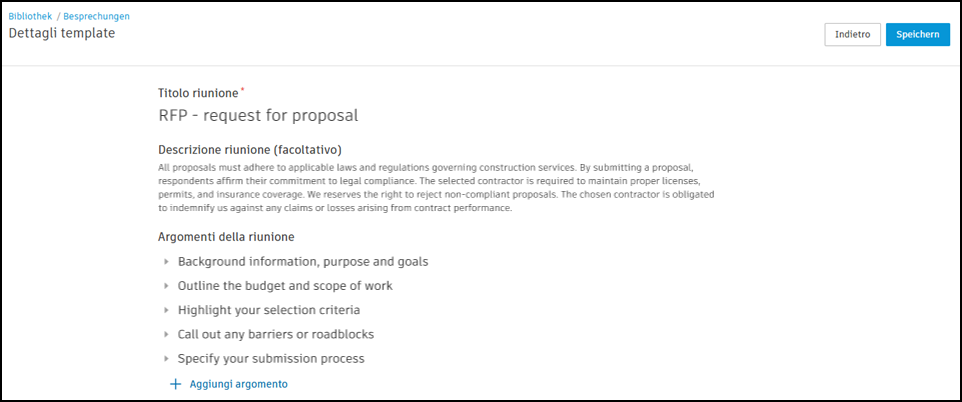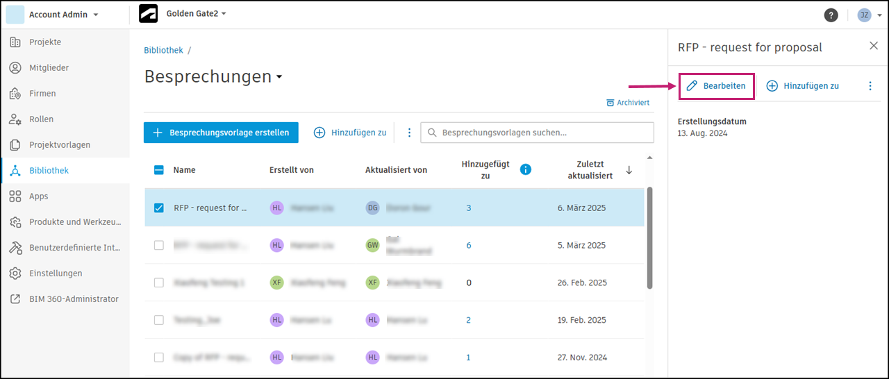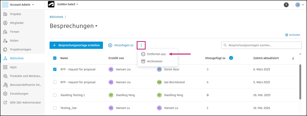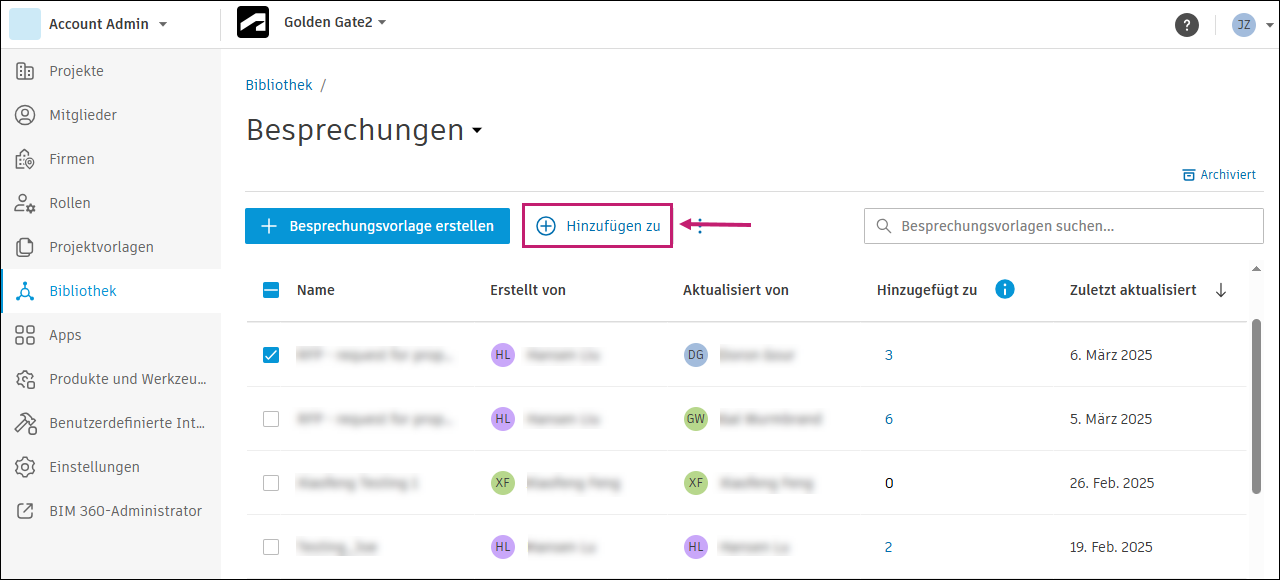 Kontoadministratoren und Standards-Administratoren können in der Bibliothek Besprechungsvorlagen für ihr Konto erstellen und sie Projekten hinzufügen.