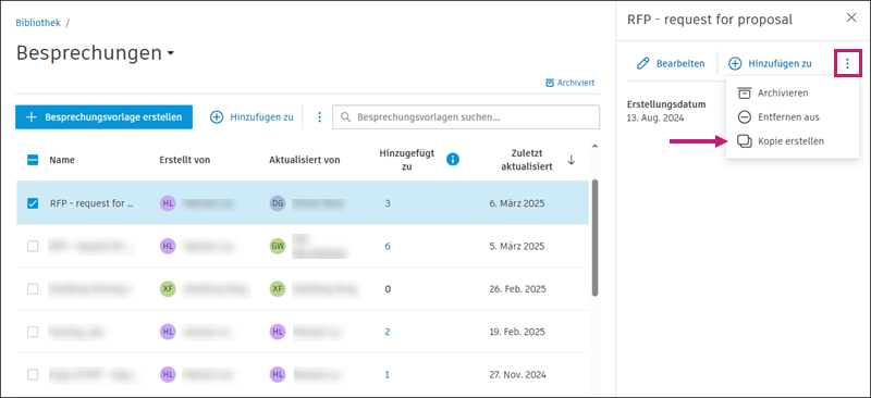 und wählen Archivieren aus.Durch das Erstellen von Kopien einer Besprechungsvorlage können Sie schnell Vorlagen für verschiedene Projekte oder Zwecke generieren.