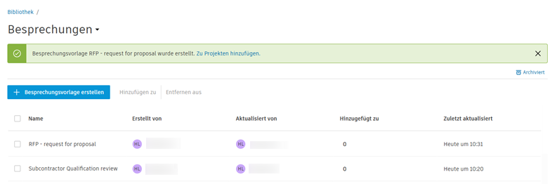 Die wiederhergestellte Vorlage wird automatisch in den Projekten angezeigt, denen sie zuvor hinzugefügt wurde, und kann zum Erstellen einer Besprechung verwendet werden.