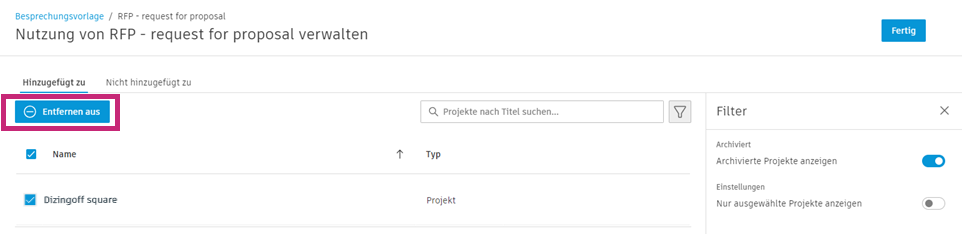 Wenn Sie Projekte ausgewählt haben, klicken Sie auf Entfernen aus, um die Vorlagen zu entfernen.