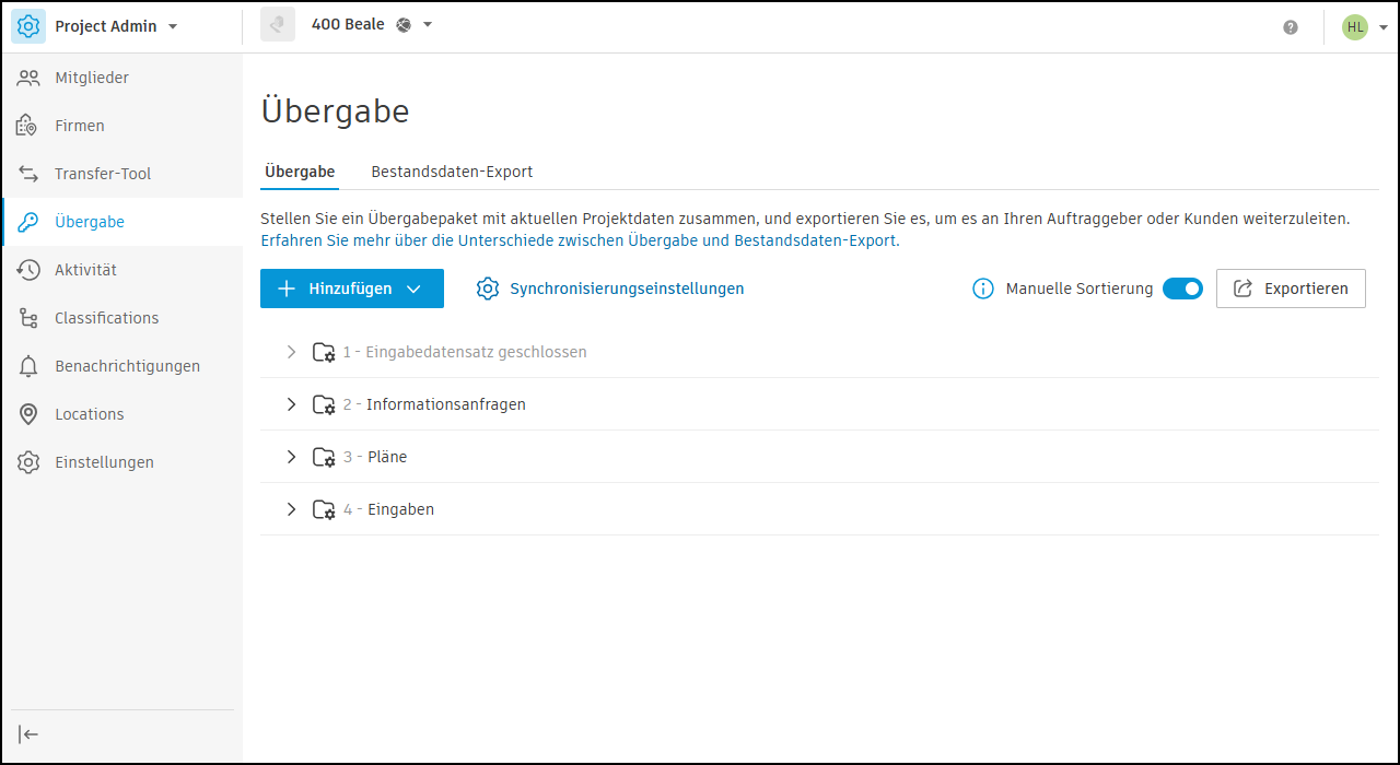 Die Übergabe ist ein Werkzeug für die Paketzusammenstellung in Project Admin. Hier wird die Dokumentation für die Übergabe zusammengestellt, erfasst und organisiert, die letztendlich exportiert und dann an den Auftraggeber oder Kunden weitergeleitet wird.