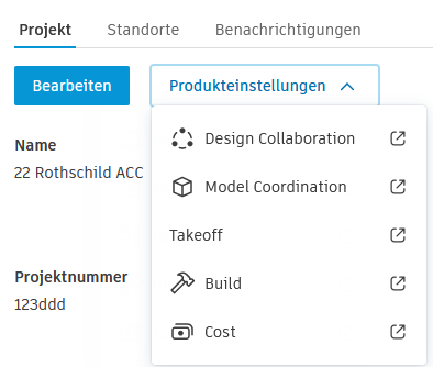 Zu den Projekteinstellungen gehören Projektname, -typ, -adresse, Start- und Enddatum für das Projekt sowie Projektstandorte. Bei Verwendung von Autodesk Build werden Start- und Enddatum in der Funktion Projektfortschritt im Werkzeug Start angezeigt. Diese Daten haben keine Auswirkungen auf den Abonnementzugriff für das Produkt. Projektadministratoren können diese Einstellungen im Project Admin-Dienst bearbeiten.