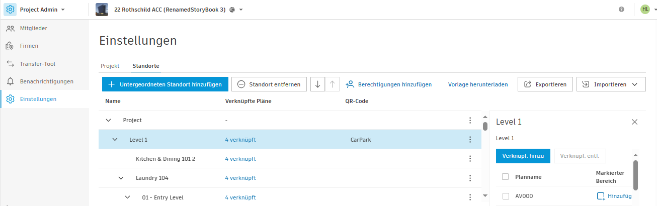 Projektadministratoren können Pläne mit den in der Standorthierarchie eines Projekts erstellten Standorten verknüpfen.