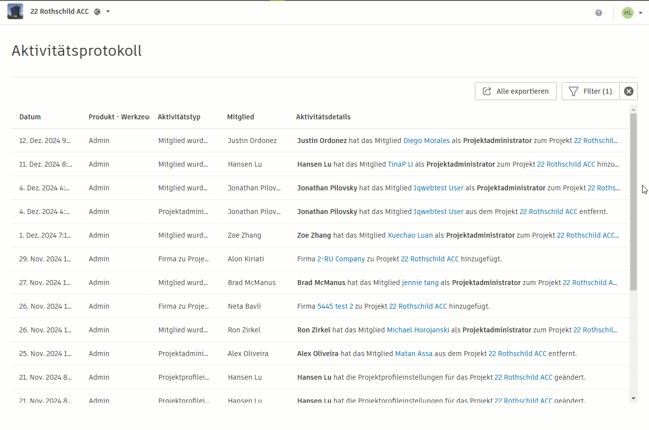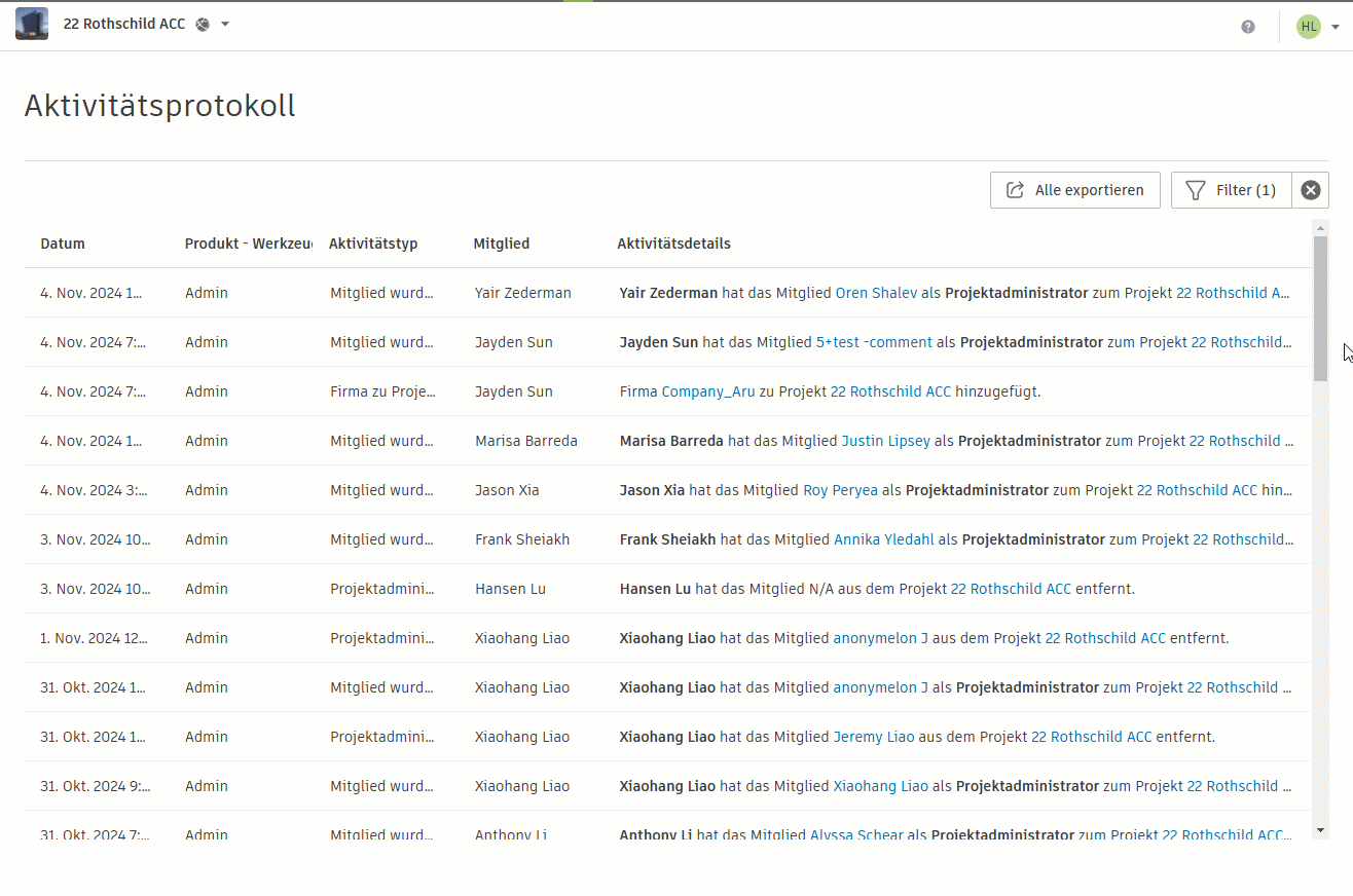 Sie können alle oder gefilterte Aktivitätsdaten exportieren.