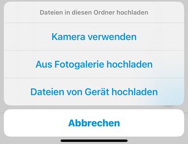 | Fehler beim Hochladen: Ordner ist nicht vorhanden | Der Ordner wurde möglicherweise nach der Auswahl und vor oder während des Hochladens der Datei gelöscht. Tippen Sie auf Wiederholen, oder laden Sie die Datei erneut in einen anderen Ordner hoch. |