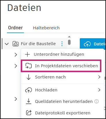 Für Projekte, die vor dem 22. März 2022 erstellt wurden, können Projektadministratoren jetzt den Ordner Für die Baustelle an eine beliebige Stelle in den Projektdateien verschieben, um die Stammordnerstruktur zu vereinfachen und von erweiterten Ordnerberechtigungen zu profitieren. Nach dem Verschieben können Mitglieder ihre Dateien und Ordner verwalten, einschließlich: