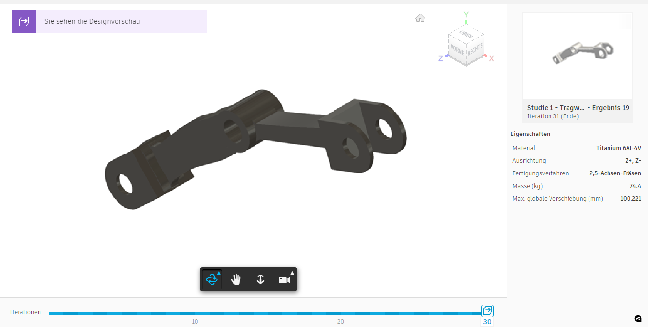 Verwenden Sie im Werkzeugkasten Ergebnisansicht zum Untersuchen der Details des Ergebnisses die Navigationswerkzeuge wie Orbit, Pan und Zoom