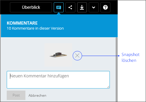 Wenn Sie einen Kommentar abgeben, wird dem Kommentar automatisch eine Momentaufnahme Ihrer Ansicht des Designs hinzugefügt. Sie können die Ansicht des Designs anpassen, bevor Sie den Kommentar veröffentlichen. Wenn Sie die Momentaufnahme nicht als Teil des Kommentars einbeziehen möchten, können Sie sie löschen.