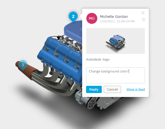 Um Markierungen von Kommentaren zu Punkten und Objekten im Ansichtsbereich anzuzeigen, klicken Sie in der Viewer-Symbolleiste auf Markierungen einblenden.