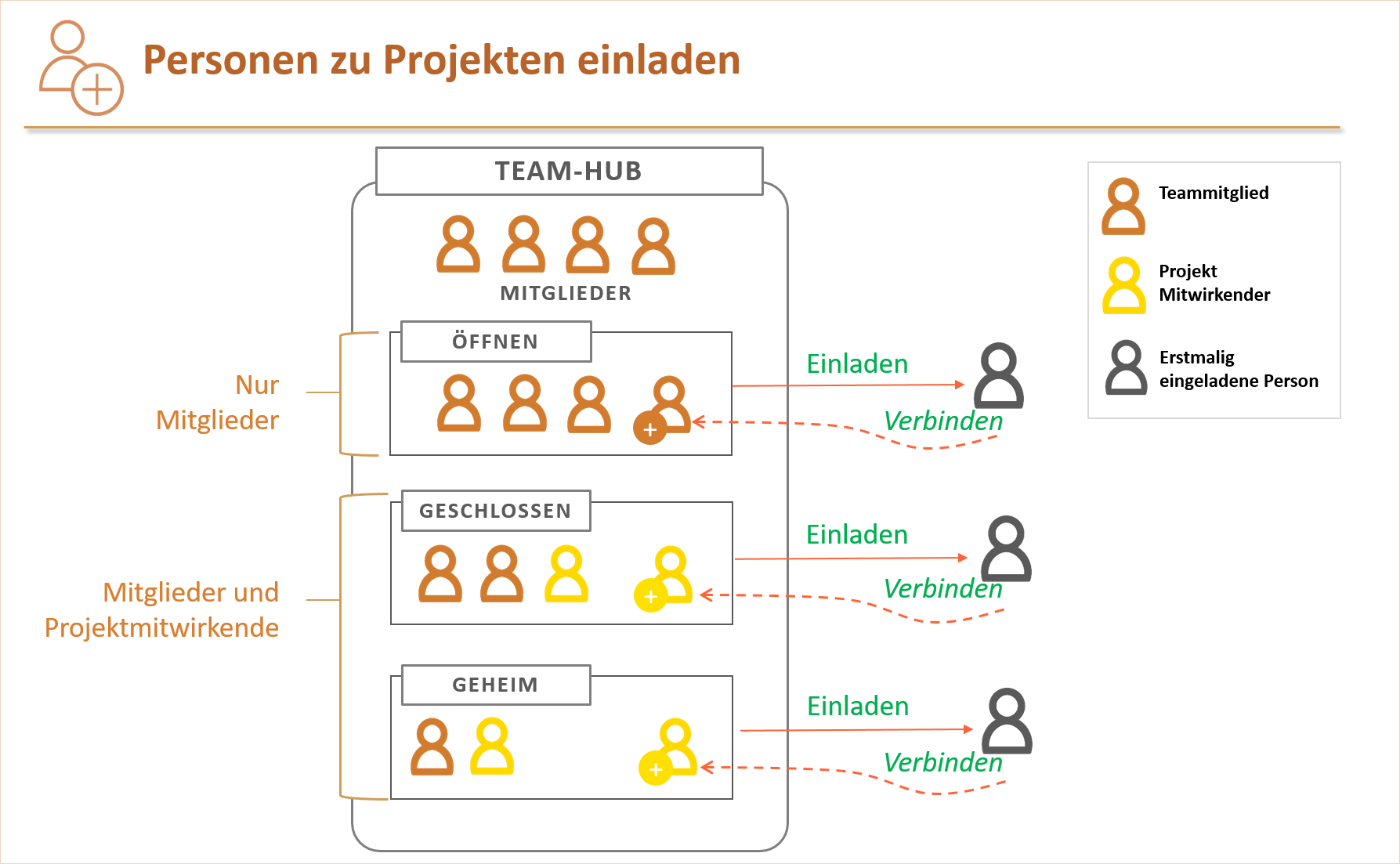 Die Mitgliedschaft in Projekten kann der Genehmigung durch den Projektadministrator oder Teamadministrator unterliegen. Die Ergebnisse von Einladungen zu geöffneten, geschlossenen und geheimen Projekten hängen von den Hub- und Projekteinstellungen ein. Vorgabemäßig ist in einem Hub der Zugriff von Projektmitwirkenden (PM) zulässig und jedes Projekt, das Sie erstellen, ist ein geschlossenes Projekt.