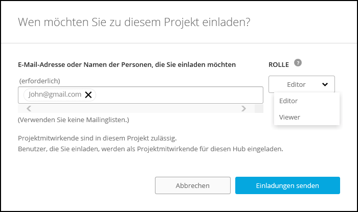 Beim Einladen von Personen zu einem Projekt können Projektmitglieder eine Rolle für eingeladene Personen angeben. Eingeladenen Personen kann die gleiche Rolle wie dem Projektmitglied oder eine geringere zugewiesen werden.