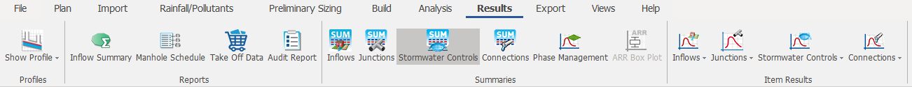 The Stormwater Controls Summary result table appears automatically after an Analysis has been run. These results indicate at a glance how oversized or how close to over-topping a Stormwater Control (SWC) may be. If the Summary is not open, select the Stormwater Controls Summary result table from the Summaries section of the Results ribbon.