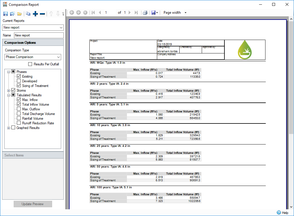 A quantified comparison between the Existing and Sizing of Treatment phases can be made using the Comparison Report option under the Results ribbon.