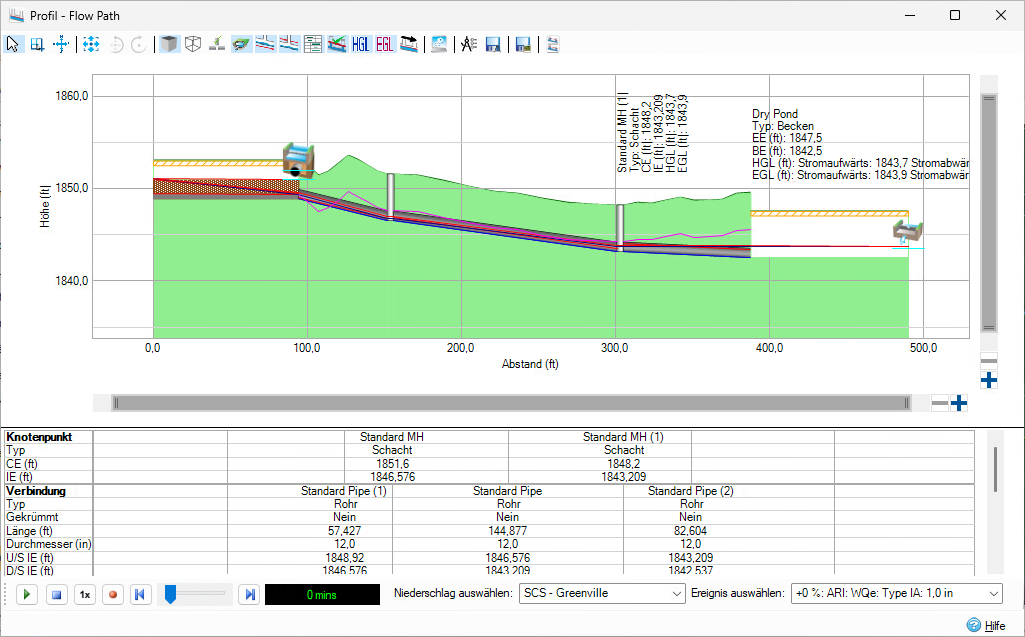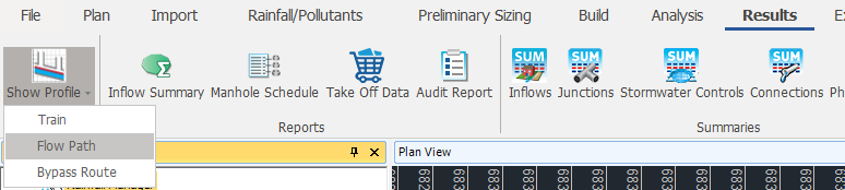 Viewing a long section Profile of the entire Treatment Train is often the easiest way to check the volume performance on a site. The Show Profile > Flow Path can be selected under the Results ribbon. The Profile animation playback is located at the bottom of the Profile view. Note that all objects shown within the Profile view can be edited by double-clicking an individual item.