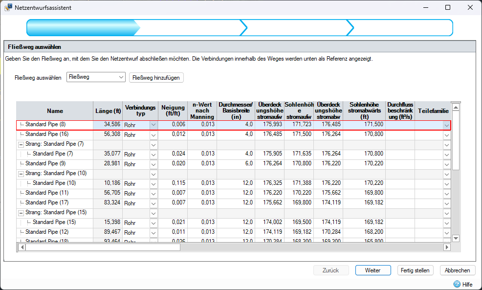 - Once the Network Design Wizard is opened, a new or existing Flow Path can be selected for sizing, including the entire Flow Path and all of its tributary branches. Since only one Flow Path has been created, simply select