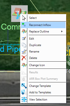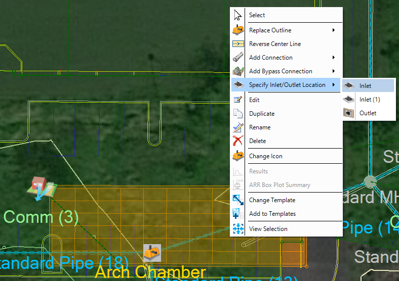 - When the Pipe Network was imported, any Junctions that fall on unconnected Inflow Areas are automatically connected to the adjacent Junction. If there are multiple Junctions imported on top of the same Inflow Area, only one will be connected, so it is important to review if all of the automatic connecting occurred as expected. In the case of Comm (3) and the Arch Chamber SWC, it appears that the Inflow Area connected automatically to the structure downstream of the Arch Chamber SWC. This can be easily updated by right-click on Comm (3) and select Reconnect Inflow. Then place the inlet next to the parking island as shown.