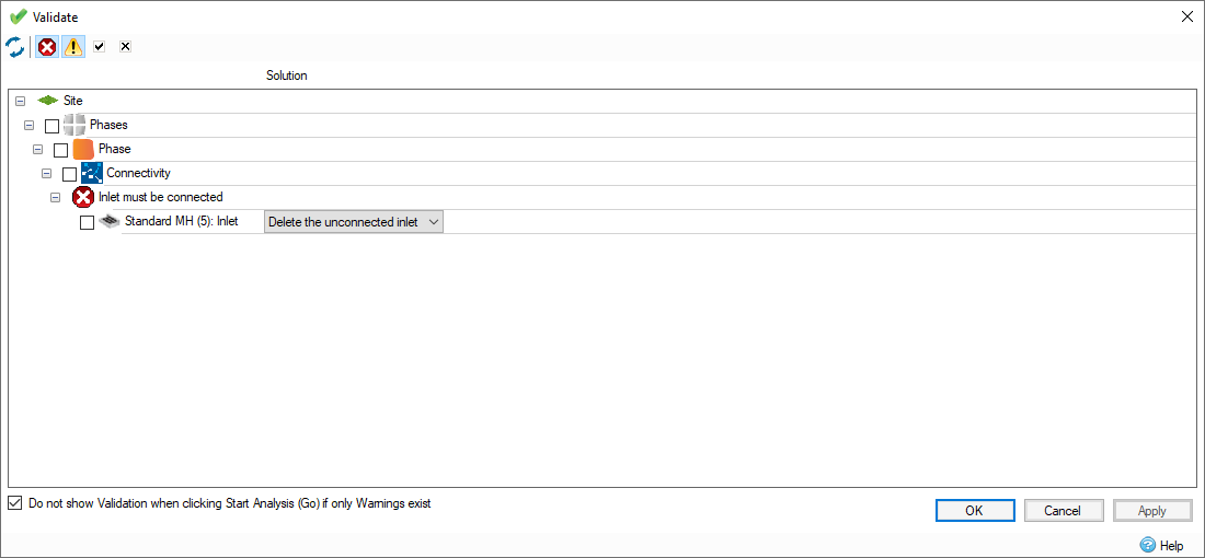 - For a system wide check for any potential discrepancies, under the Analysis ribbon select either Validate or Go – this will check the data and list any potential issues in the model.