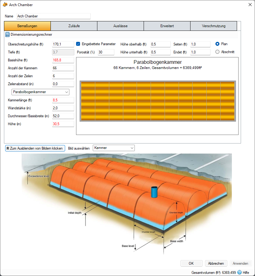 - Double-click or right-click and select Edit to review the Arch Chamber Stormwater Control (SWC) properties. This facility uses the Parabolic Arch Chamber configuration type and the individual chamber section lengths, wall thickness, diameter and height are all as noted in manufacturer specifications. Any change to input that would affect the facility extents will be represented in Plan, just like any changes to the Plan layout will update dimension details within the SWC properties. Use the Click to Show Images button in the lower left of the dialog to view a schematic of what the underground detention chambers looks like.