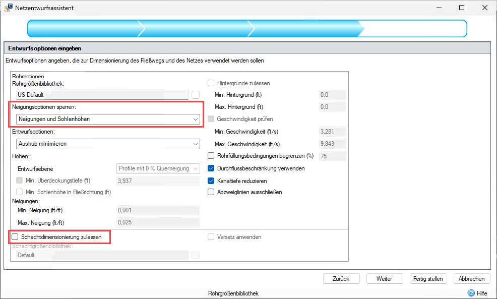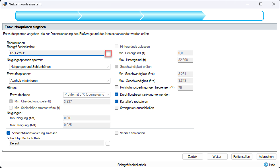 Allow Manhole Sizing, this means the manholes sizes in the template used will not be changed. Select Next on the
