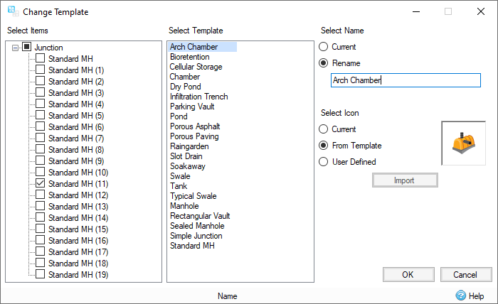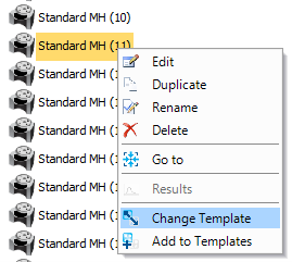 - Right-click Standard MH (11), on the Plan or under Junctions on Tree view, and select Change Template. We could change more than one object at once but on this occasion, we are only changing one manhole.