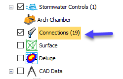 Since CAD does not represent Stormwater Controls (i.e. Ponds, Swales, Raingardens) as richly in Plan as InfoDrainage does, the Pipe Network that was imported is overly simplified and uses ‘dummy’ objects as placeholders for designers who are forced to split their work between several tools. To achieve proper Runoff Mitigation an Underground Detention Arch Chamber needs to be added, which can be easily done by converting the ‘dummy’ junction into a full Stormwater Control (SWC).