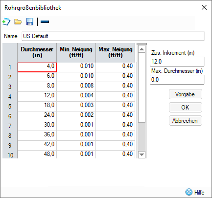 Pipe Size Library. A default Pipe Sizing Library has already been created and loaded. A list of typical pipe diameters and associated min/max design slopes will be shown. These may vary per manufacturer but these values will be used for the sake of the tutorial project.