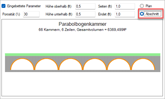 - The embedded parameters allow for the fill material above and around the chambers to be applied toward facility storage. Notice that the schematic view of the detention facility can be switched from Plan (top down) view to a Section (or an on-end profile) view.