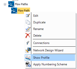 Flow Paths from the Tree View, select Add and click once on the Junction at the top-middle of the site then once at the downstream most Junction at the lower right corner of the site. Hit the Esc key to end the action, then right-click Flow Paths and select Show Profile.