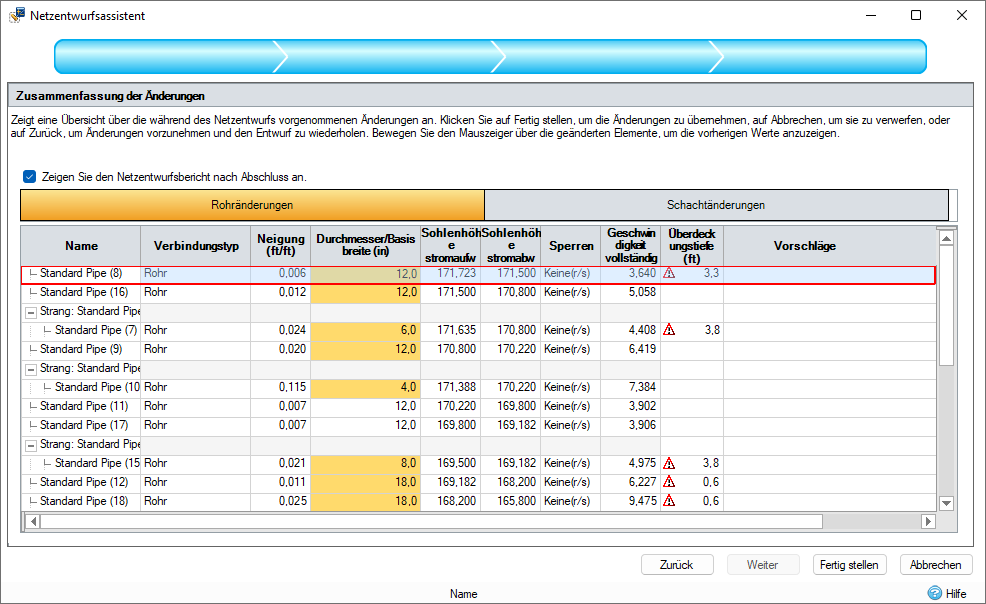 Summary of Changes table lists the changes made to the network, with cells highlighted in orange to indicate the value has changed. By hovering over a highlighted value the previous value can be seen. As the invert elevations and slopes of the pipe network were locked only Diameter changes were made to accommodate incoming flow to the system, based on the Preliminary Sizing Inflow Area parameters and the constraints chosen in the 'Flow Criteria' step of the wizard. Select