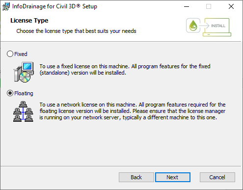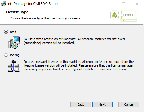 - Wählen Sie auf dem Bildschirm Lizenztyp die Option Fest aus. Bei diesem Installationstyp werden alle Programmfunktionen für die feste (eigenständige) Version installiert. Klicken Sie auf Weiter. Weitere Informationen finden Sie unter Lizenzierung.