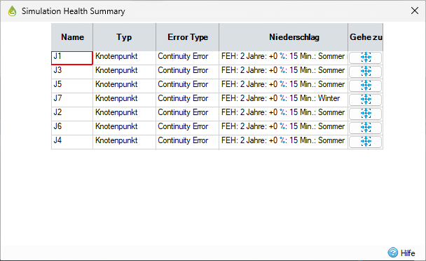 Die Tabelle Simulationszustand – Zusammenfassung enthält detaillierte Informationen zum Fehlertyp für bestimmte Knotenpunkte, Zuflüsse, Regenwassersteuerungen oder Verbindungen. Außerdem werden unter anderem Prozentwerte für den Fehler, die Fehleranzahl und das Niederschlagsereignis angezeigt, auf das sich der Fehler bezieht.