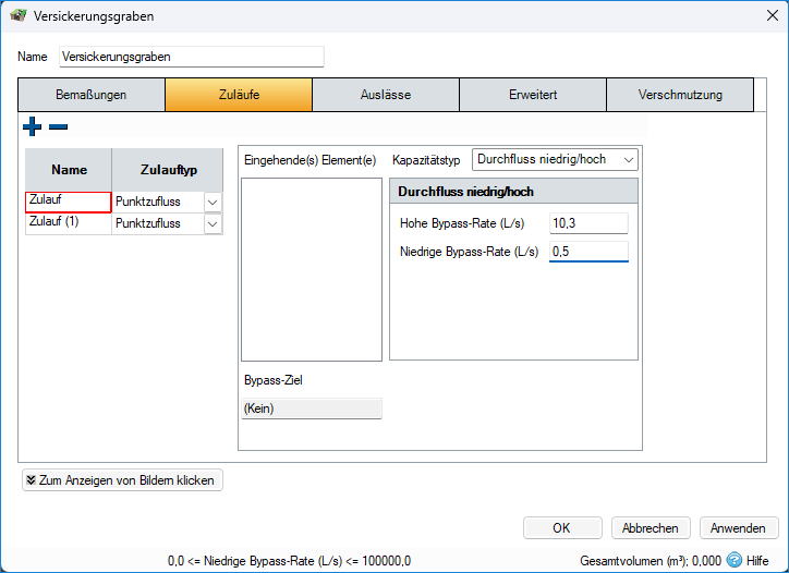 Mit dieser Funktion können Ober- und Untergrenzen für die Volumenstromraten des Bypass festgelegt werden. Alle Volumenstrommengen außerhalb dieser Grenzwerte umfließen dann diesen Zulauf. Alle Durchflussmengen innerhalb dieser Grenzwerte fließen in die Regenwassersteuerung oder den Knotenpunkt.
