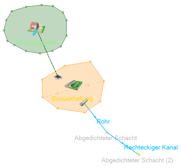 Anmerkungen: Anhand des Zulaufs kann das Volumenstromziel in einem System mit mehreren Schichten bestimmt werden, z. B. ein Drängraben oder eine Biorückhaltung. Ebenso kann anhand des Zuflusstyps angegeben werden, dass ein Zufluss seitlich, also entlang der Länge, und nicht am stromaufwärts liegenden Ende (Punkt) erfolgt.