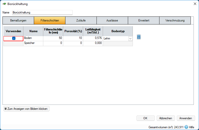 Basis-Versickerungsrate: Definiert die Versickerungsrate durch die Basis des Filterbereichs. Dies sollte anhand eines Leistungstests am Standort ermittelt werden.