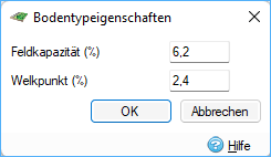 Bodentyp: Der für die Bodenschicht verwendete Bodentyp; kann mit dem Rechner für die Bodeneigenschaften weiter angepasst werden.