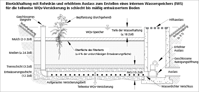 Lösungshöhe: Höhe über der Sohle des Rohrs mit Rohrdrän, an der das Wasser ausgeleitet wird (im Diagramm unten rot markiert). Dies wird häufig verwendet, um eine gesättigte Zone zu erstellen.