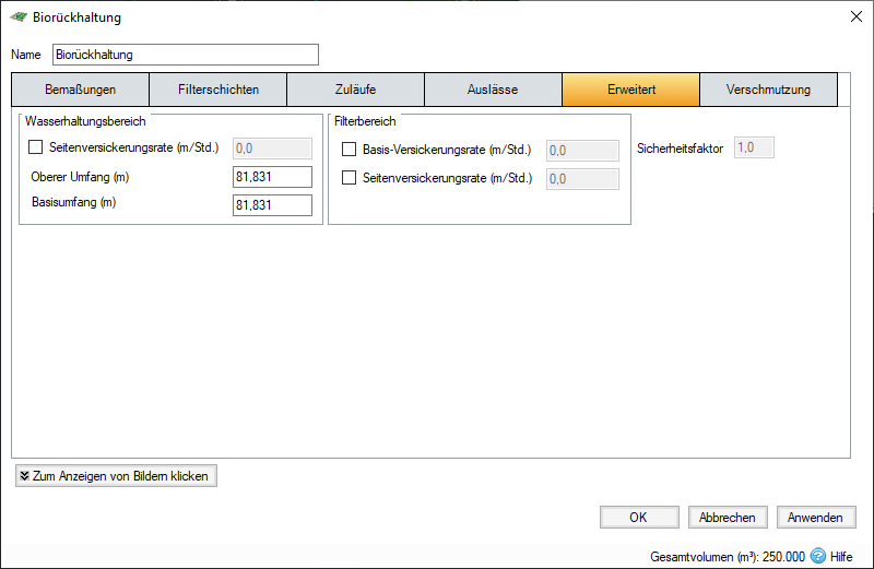 Seitenversickerungsrate: Definiert die Versickerungsrate durch die Seiten des Wasserhaltungsbereichs. Dies sollte anhand eines Leistungstests am Standort ermittelt werden.