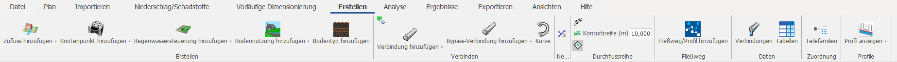 Die Multifunktionsleiste Erstellen ermöglicht das Hinzufügen von Datenelementen zum Entwurf sowie die Erstellung von Volumenstromreihen und Fließwegen.