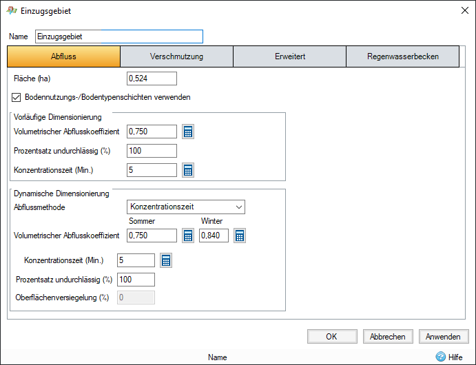 Wenn diese Werte hier nicht eingegeben werden, werden die Vorgabewerte oder die Werte der aktuellen Abflussmethode zur dynamischen Dimensionierung verwendet.